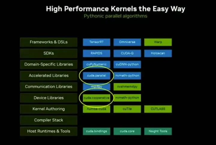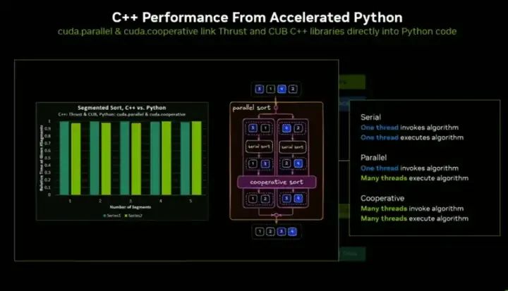 其中一个方案叫做cuda.parallel,如果你熟悉C语言中的Thrust库,就会明白它的作用。这些是基础并行算法,你可以直接从CPU端调用排序、直方图统计等功能。这些算法库都经过加速优化,你可以将它们组合成完整的并行算法。另一个方案是cuda.cooperative,当你在编写Python GPU连接代码时,仍然可以调用这些经过极致调优的高性能加速库。