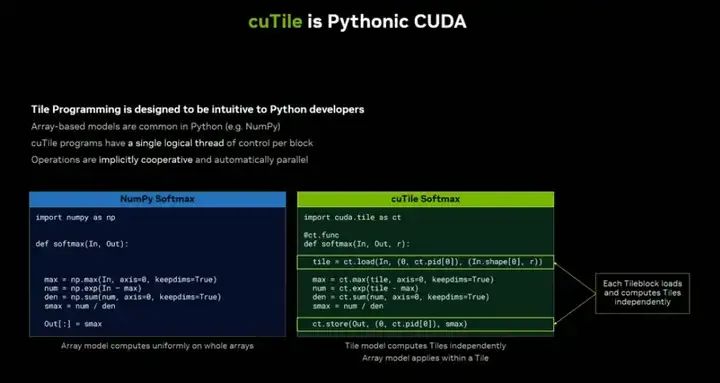 回到之前的观点,这种设计本质上更符合Python哲学。现代Python开发者不会纠结线程细节,而是直接操作数组。Numpy就是数组,数组相加生成新数组——这种思维方式与cutile完美契合。