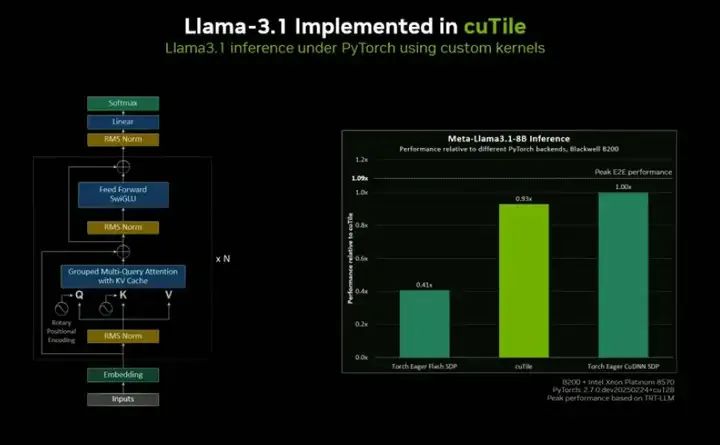 我们用cutile实现了Llama 3.1推理引擎,并通过PyTorch部署——毕竟没人想从零造轮子实现KV cache。就像将手工优化的内核注入PyTorch那样,我们利用yTorch工具完成了这项部署。