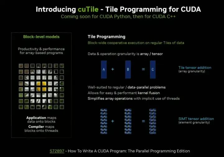 我特别想谈谈中间的块级模型,因为我认为它在投入与回报之间达到了很好的平衡。我们开发了一个名为cuTile的工具,这是为CUDA设计的分块编程扩展。与传统的元素级操作不同(如图片底部所示),我们采用数组运算的方式: