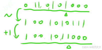 因为 -n 其实就是 n 的取反后加一,也就是说 -n 相当于将最右侧的 1 左边的区域全都变成相反,如下所示: