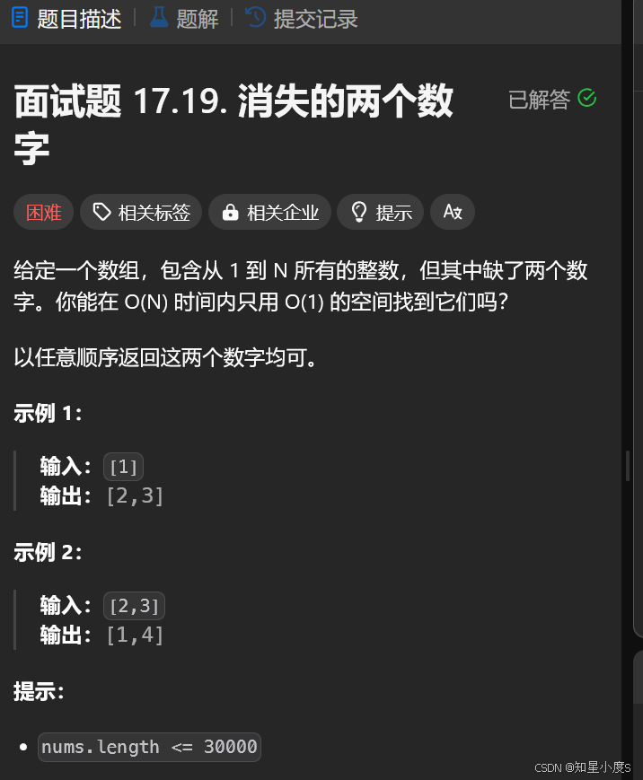 有了前面的基础,相信这一道题目就比较简单了,事实上,与只出现一次的数字Ⅲ方法是类似的,如果我们再有1~N的数据,那么不就是两个数字出现一次,其他数据出现两次了吗~