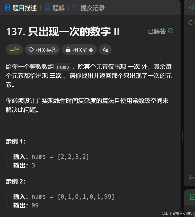 这个题目有点难度了,有一个数字出现了一次,其他数字出现了三次~