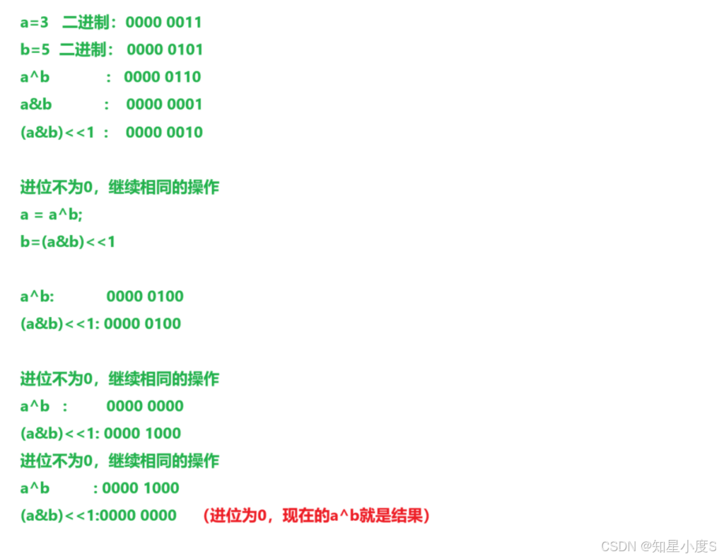 思路:不断地进行a^b得到无进位相加的结果,(a&b)<<1得到进位的结果,直到没有进位就得到想要的结果~