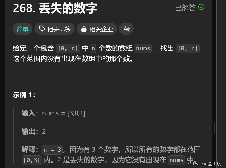 思路2:使用位运算,得到0~n的数据,与原来的数组元素进行异或,结果就是原来数组没有存在的数据~
