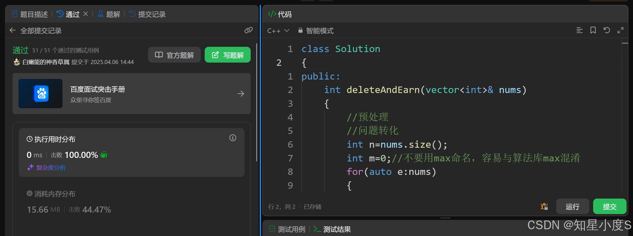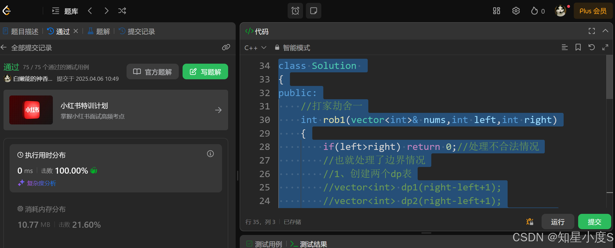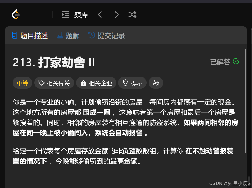 1、选择【0】位置,显然【1】位置和【n-1】位置都不能进行选择了,但是在【2】~【n-2】这个区间内,我们不就可以随便选择了吗~也就可以使用前面我们打家劫舍的思路了~ 2、不选择【0】位置,显然【1】位置和【n-1】位置都能进行选择,那么在【1】~【n-1】这个区间内,我们就可以随便选择~也就可以使用前面我们打家劫舍的思路了~