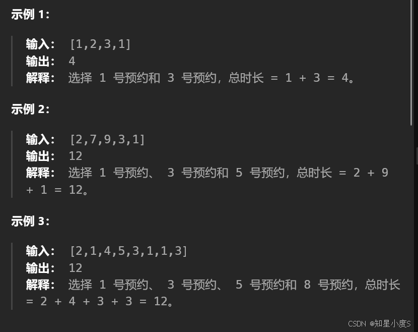 结合这里的题目要求+经验: dp1中的dp1[i]表示为到达该位置并且选择该位置预约的最长预约时间~ dp2中的dp2[i]表示为到达该位置并且不选择该位置预约的最长预约时间~