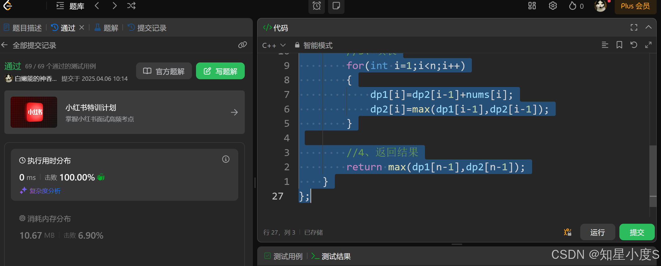 我们可以看到,状态转移方程里面有i-1当i=0的时候显然会出现越界的情况,所以我们需要进行初始化 结合前面如果不想初始化太麻烦,我们可以多申请一些空间,但是事实上这个题目初始化比较简单,直接初始化dp1[0],dp2[0]就可以了,所以我们直接进行初始化~ dp1[0]就是选择0位置预约, dp2[0]就是不选择0位置预约,那么我们初始化结果就是 dp1[0]=nums[0],dp2[0]=0