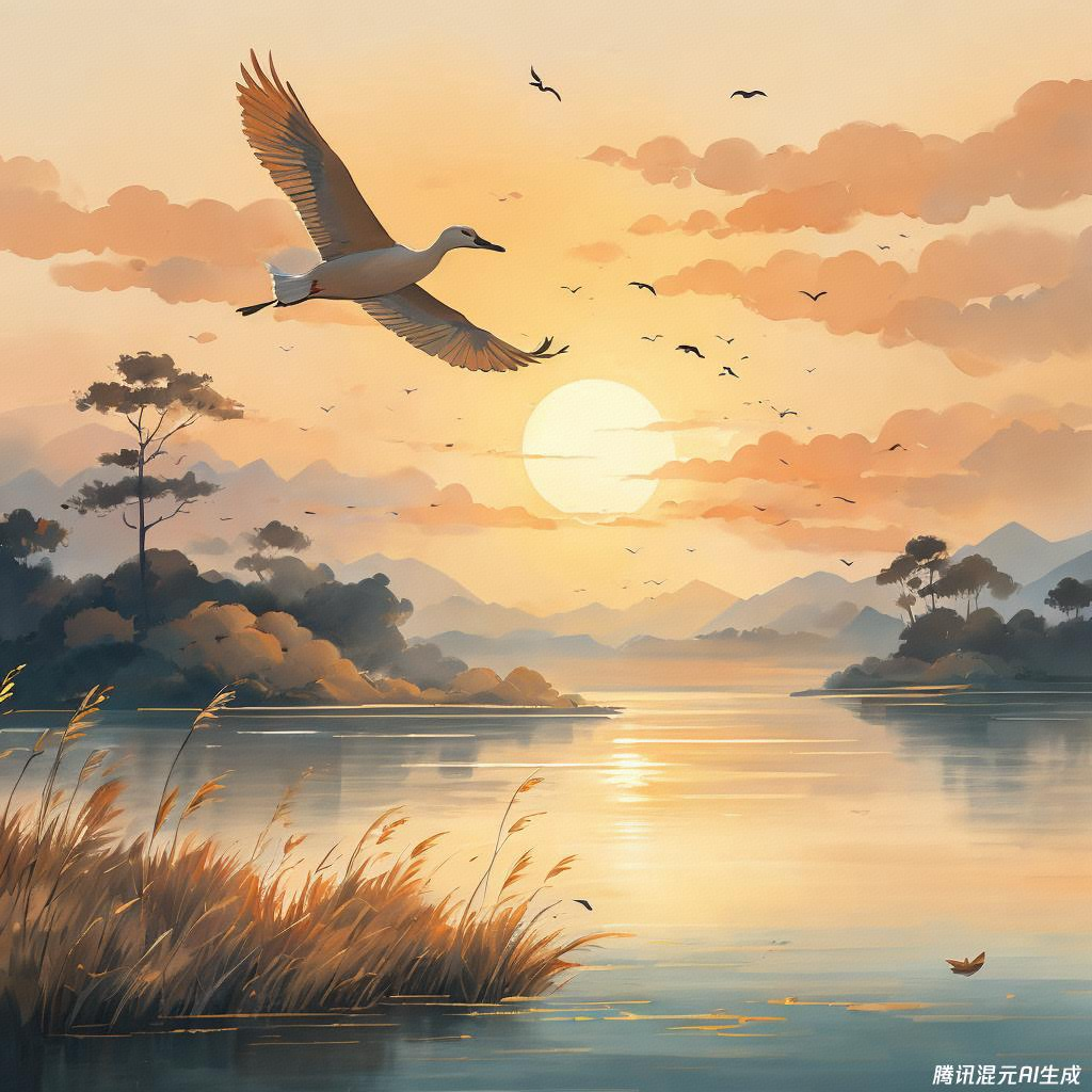 比如这一段Prompt:生成一幅图:“落霞与孤鹜齐飞,秋水共长天一色”