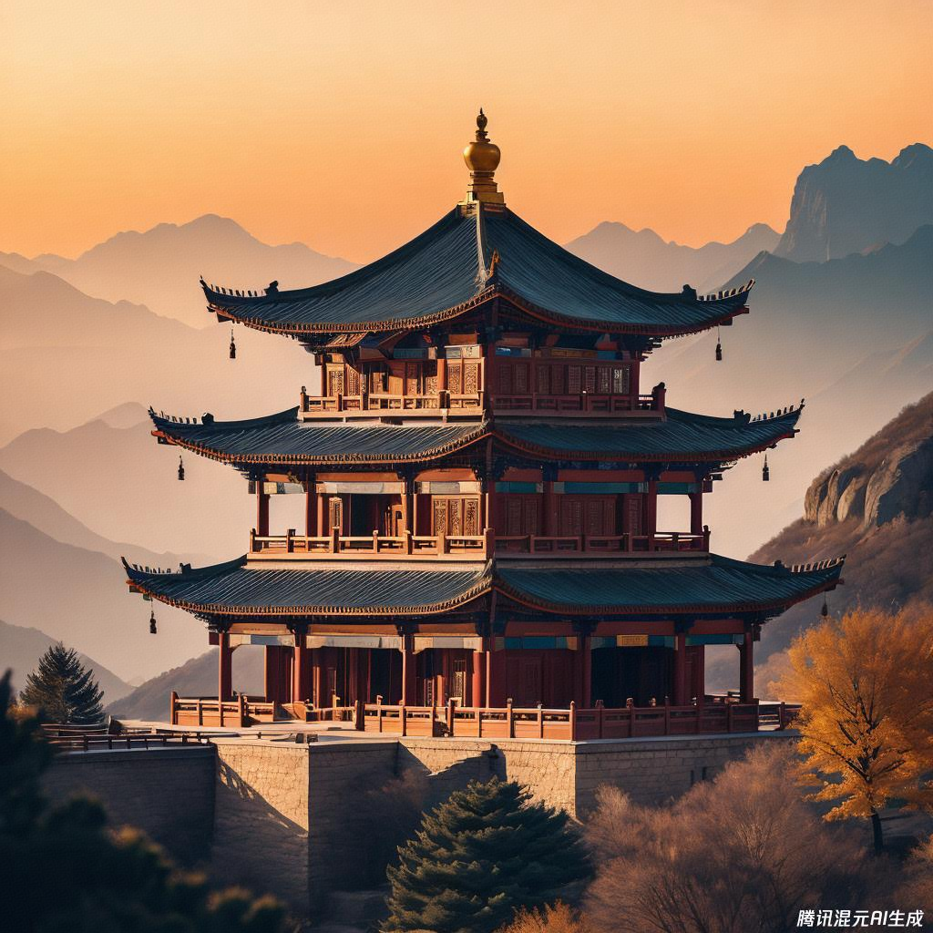 生成:“一座古风的楼阁,周围都是山峰。”(PS:终于又能把阁楼的飞檐画对的了!!!)