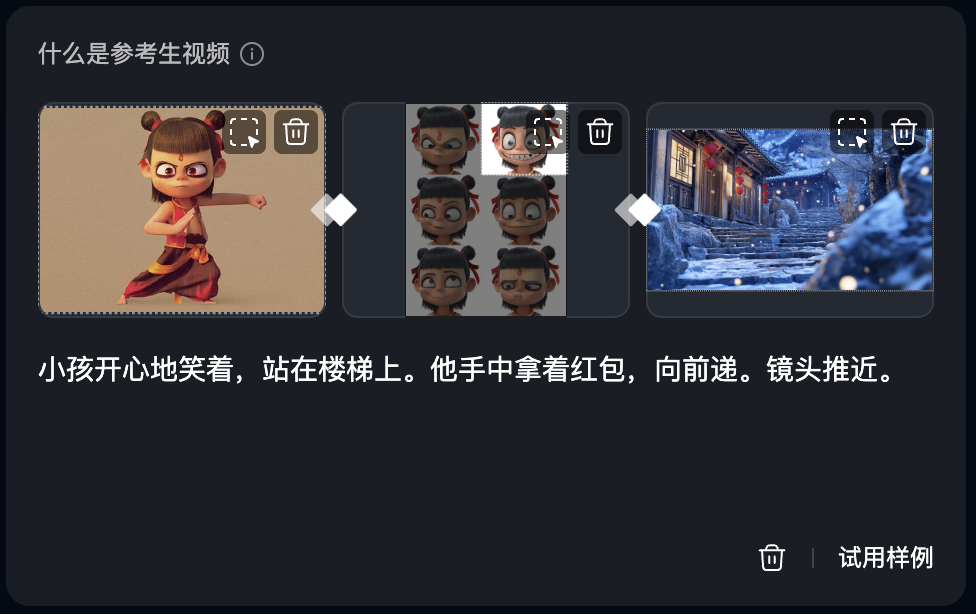 简单来说就是:图1的位置,可以上传视频的主体;图2的位置上传主体的参考表情或者服装;图3可以传场景、道具或者其他什么物体都行。
