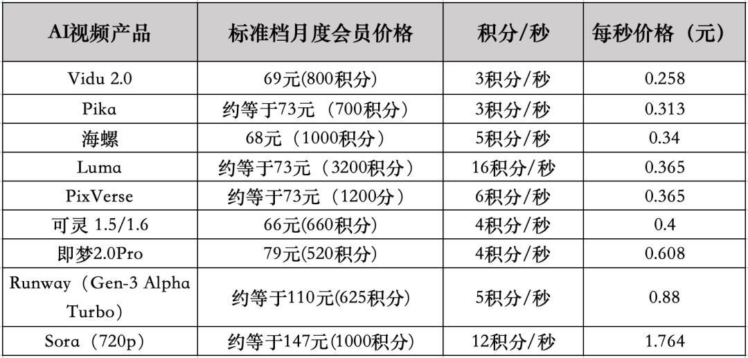 我们也把市面上目前主流的AI视频价格都整理了一下,直接单月购买非连续包月,全都按图生视频720P的质量,横向对比每秒的价格:
