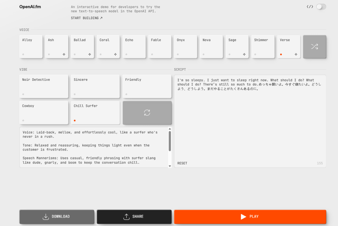 这次OpenAI给gpt-4o-mini-tts做了一个小小的功能演示网站,约等于免费给大家用了。