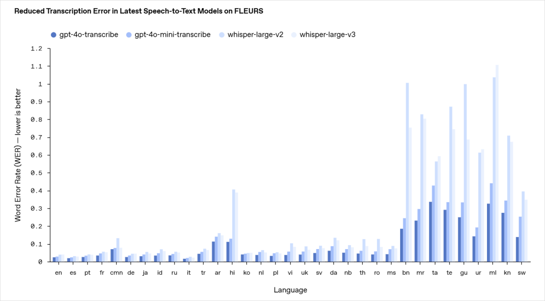 这个是OpenAI的几个STT模型在FLEURS数据集上的词错率(Word Error Rate, WER)的对比表现。纵坐标表示词错率,越低代表模型的转录准确性越高;横坐标代表不同语言。