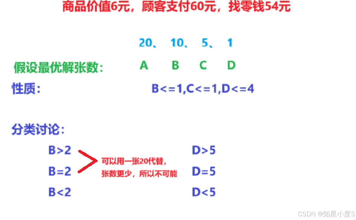 我们首先假设最优解得到的面值为20、10、5、1的张数分别为A、B、C、D,我们首先来看看它们的特点/性质: