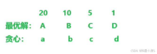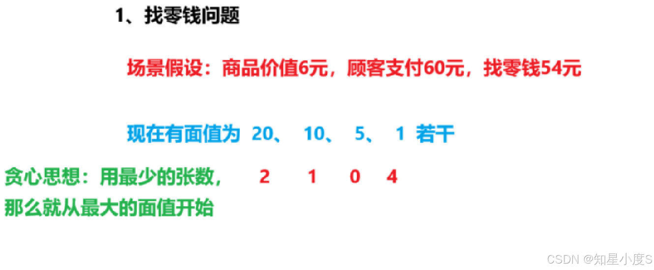 答案是第一种,我们不难发现5美元是有很大用处的,10美元可以找,20美元也可以找,结合我们的生活经验,我们应该尽可能的保留5美元~这里就体现了我们贪心思想,优先选择当前情况下的最优解,最终得到全局的最优解~