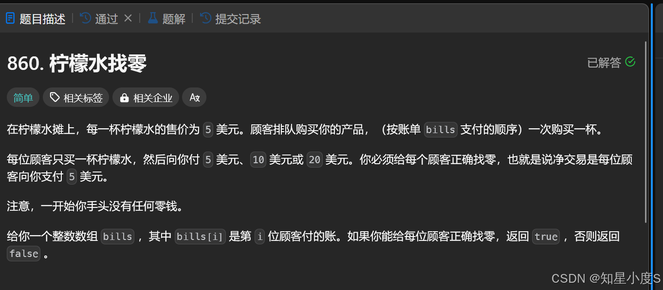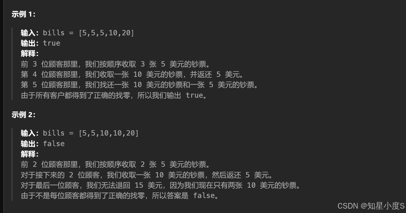 这个题目告诉了我们一杯柠檬水5美元,顾客可能给5美元/10美元/20美元,最开始我们手上没有任何的美元,这也就说明我们只能利用顾客给我们的钱进行找零~并且顾客是排队购买的,必须成功找了零钱才能继续收下一个顾客的钱~