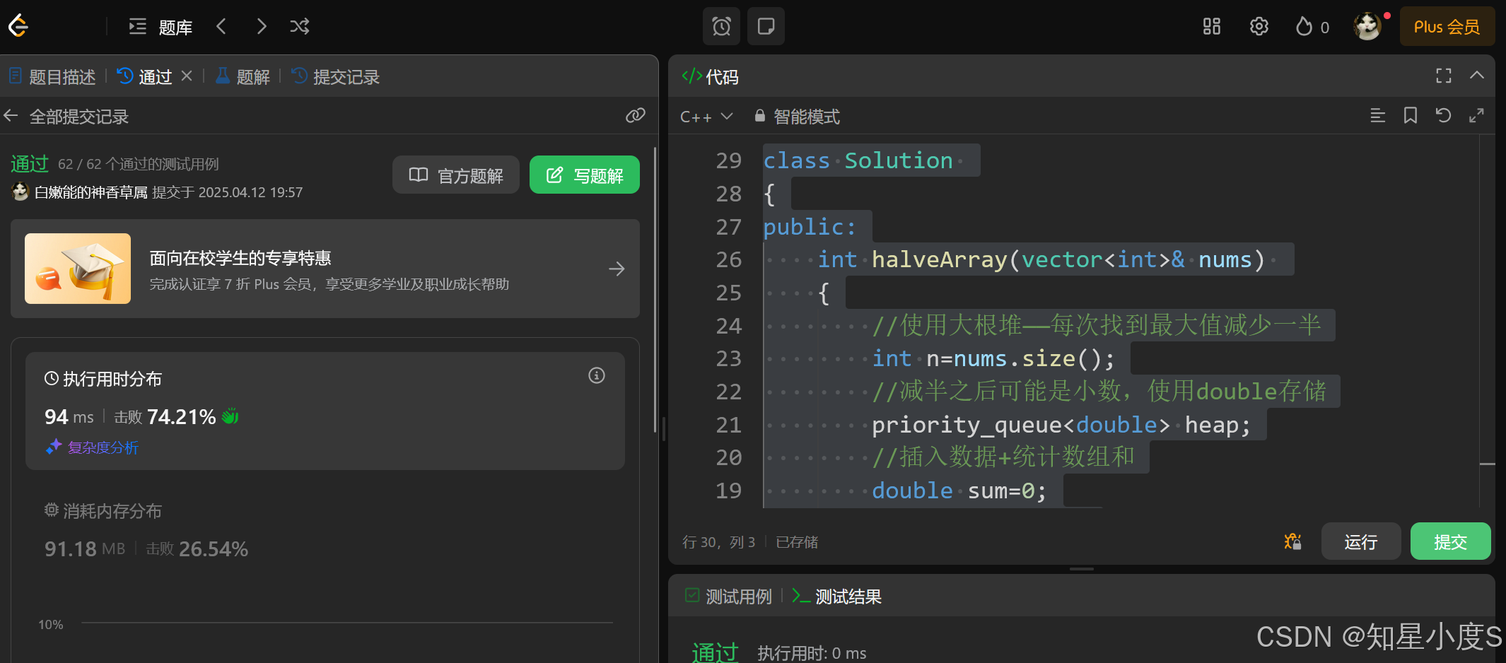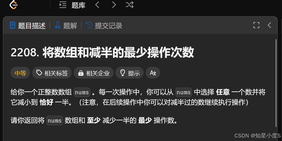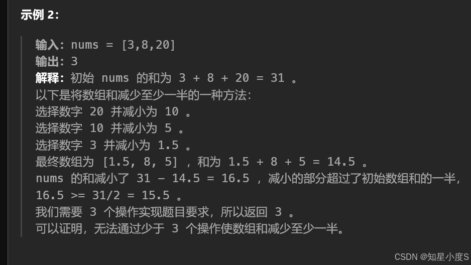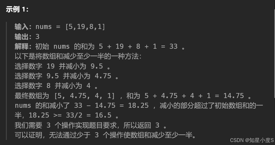 贪心策略: 每一次找到数组中最大的数(我们可以使用大根堆)进行减半操作,再把减半的数重新放入数组中,重复操作,找到整个数组和减少一半为止~