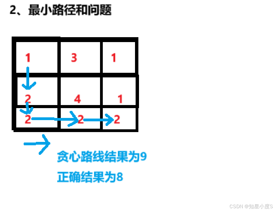 从左上角开始,我们每一步都按当前位置的最优选择(局部最优解)进行,但是不难发现结果是错误的~所以我们是"希望"得到全局最优解,但是结果不一定近人意,我们就需要更改我们的贪心策略~