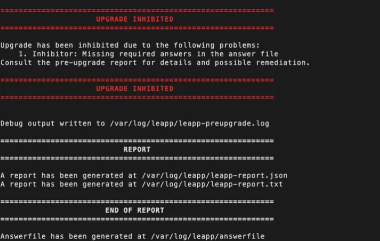按照报告的提示,在/var/log/leapp/leapp-report.txt可以获取到详细的报告信息,同时UPGRADE INHIBITED给出的影响升级的因素也可以在/var/log/leapp/answerfile文件中查看。