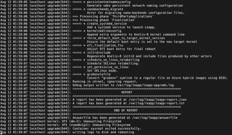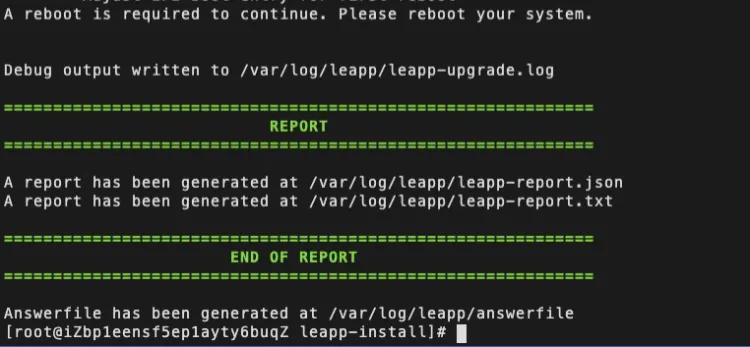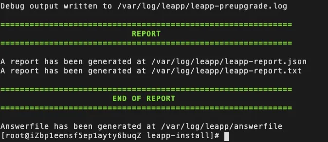 就地迁移完成后,进入新的操作系统,可以通过/var/log/leapp/leapp-report.txt查看迁移报告,报告中会包含就地迁移以及迁移后的系统详细报告信息,也可以通过/var/log/leapp/leapp-upgrade.txt查看就地迁移的执行日志。