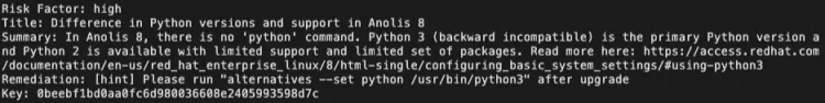 上述报告提示用户在Anolis OS中默认没有python命令,系统中默认提供的是不向前兼容的python3,并且python2只是有限支持,用户需要尽快将业务程序尽快迁移到使用python3。同时报告也给出了解决方案来使系统默认提供python命令。