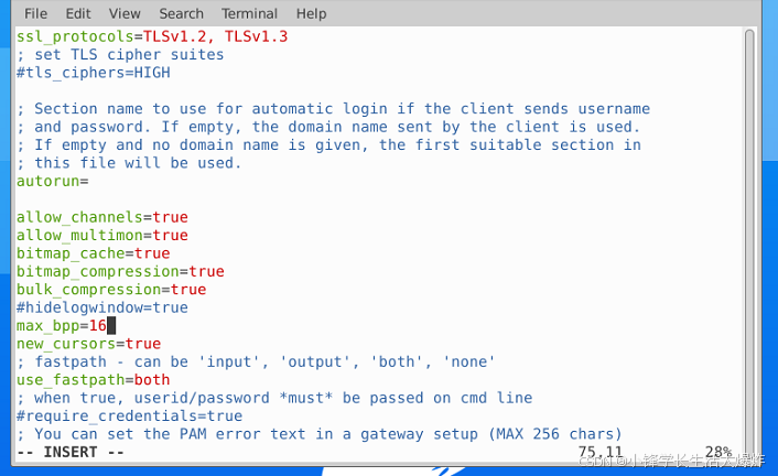 设置为“无”。这会禁用加密,加密可以通过减少服务器上的CPU使用率来提高性能。但是,只有在通过安全网络连接时才能这样做。在sesman.ini