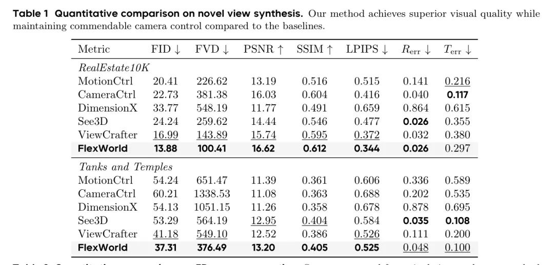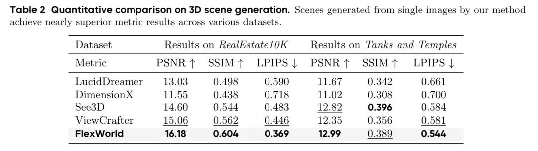 如图6的定性比较所示,FlexWorld生成的场景与输入图像的内容一致性更高,相较于其他 Baseline 方法更为一致。此外,FlexWorld还在输入范围之外的新区域生成了更高视觉质量的内容。作者还进行了定量比较,如表2所示,在Tanks [23]数据集上,除了在SSIM指标上略低于See3D外,FlexWorld几乎在所有指标上都优于其他 Baseline 方法。所有结果表明,FlexWorld生成的场景具有更高的3D一致性和视觉质量。