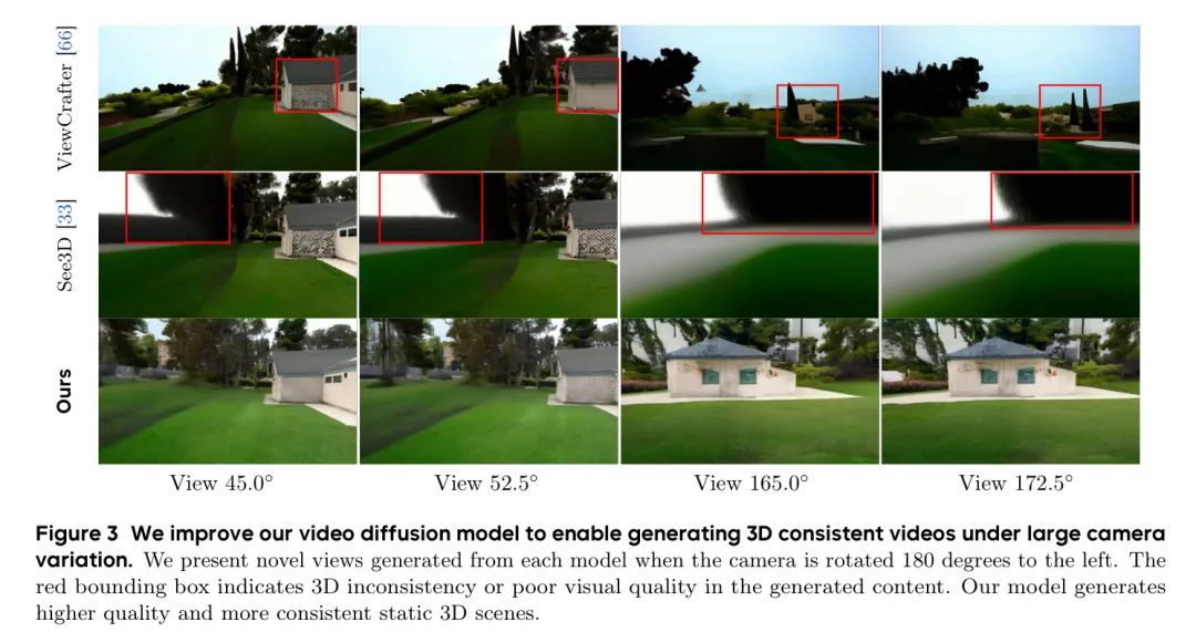 然而,这些模型并未针对静态场景生成进行设计,因为生成视频中的动态特性妨碍了其重建能力。DimensionX [44]通过几个LoRA [19]实现了基本的相机控制,但缺乏处理复杂运动的灵活性。Wonderland [29]和StarGen [67]可以从单视角和相机轨迹生成视频;但是,它们不能产生新的视频来补充现有的三维结构,从而限制了生成场景的范围。See3D [33]和ViewCrafter [66]能够接受特定场景视角中的缺失信息并进行补全,但难以应对显著的视角变化(见图3)。相比之下,作者提出了一种基于更高级视频基础模型训练的V2V模型,并利用现有场景信息,以实现广泛的相机变化,并提供一种强大的工具,用于灵活的视图场景生成。