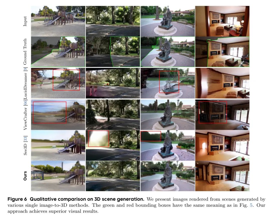 训练完成后,作者的视频模型能够在不完整的输入下生成高质量的新视角,应用于粗糙场景,并且在任意运动轨迹下表现出色,尤其是在大范围相机变化的情况下(参见图3)。这使作者的模型成为FlexWorld中最佳的视频扩散模型,显著提升了灵活视角的3D场景生成能力。