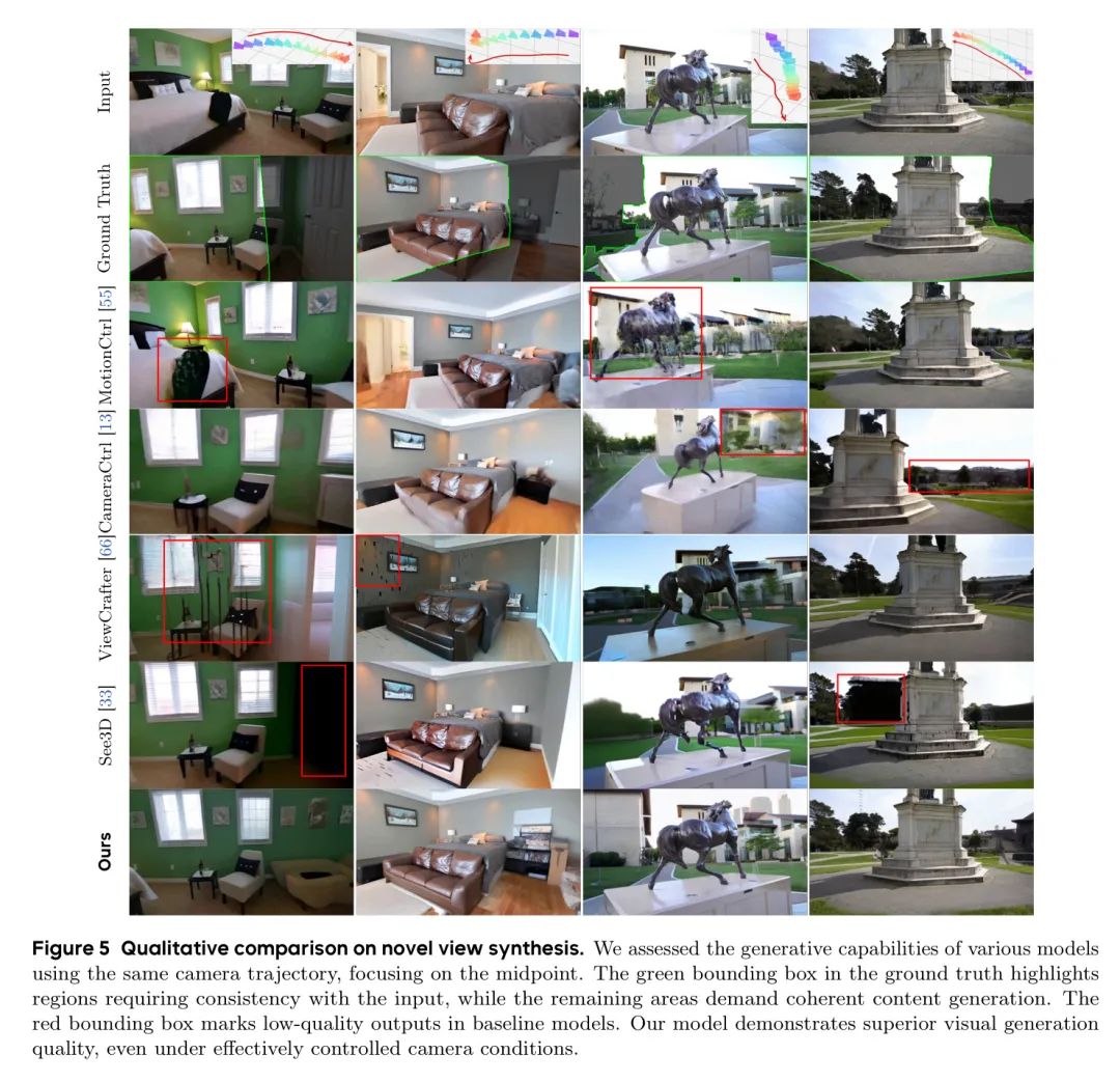 作者通过将视觉生成质量与相机准确性与5个开源 Baseline 模型(包括MotionCtrl [55]、CameraCtrl [13]、DimensionX [44]、See3D [33]、ViewCrafter [66])进行对比,评估了作者的视频到视频模型在新型视角合成方面的能力。