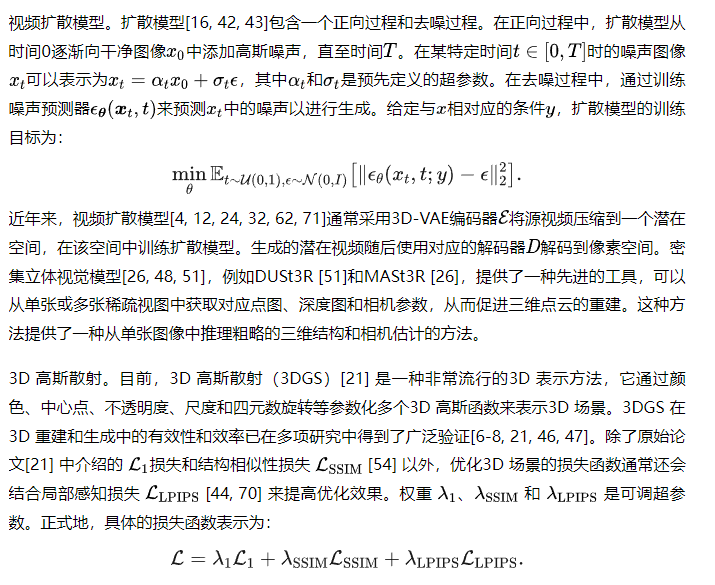 生成模型,尤其是扩散模型[16, 42, 43],为解决这一问题提供了原则性和有效的方法。虽然现有的方法通常依赖预训练的生成模型作为新颖视图合成的先验知识,但它们面临显著的局限性。基于图像的扩散方法[9, 50, 64, 65]往往会积累几何误差,而基于视频的扩散方法[13, 55]则难以处理动态内容和摄像头监督不足的问题。最近尝试通过引入点云先验以提高一致性的工作[33, 66]显示出前景,但仍然在可扩展性方面受到限制,常常在视角变化较大时失效。