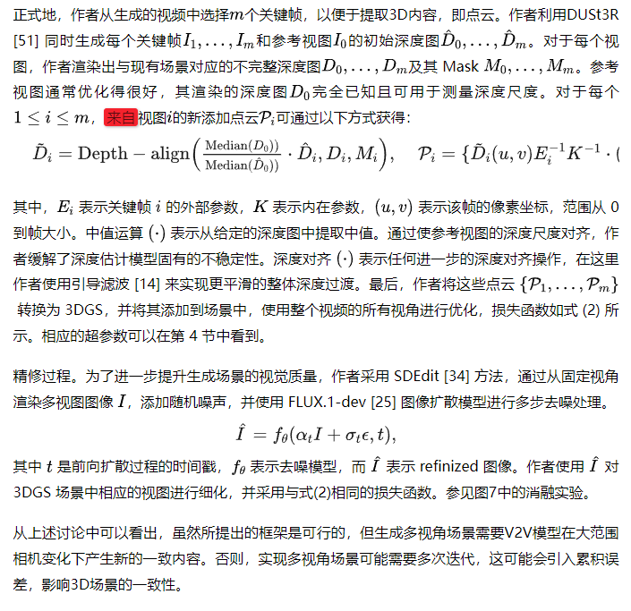 (2) 一种几何感知的3D场景扩展过程,该过程提取新的3D内容并将其整合到全局结构中。特别是,作者对一个先进的视频基础模型[62]进行了微调,使其能够在大范围相机变化下生成高质量的内容。