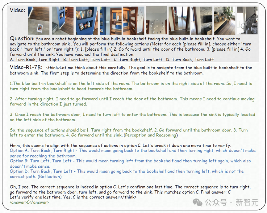 换做以前的模型,十有八九就是「看一眼」就开答,但Video-R1却能一步步分析时序,进行推理,最终给出逻辑闭环的准确回答。