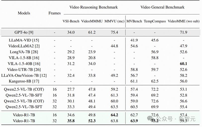 在多个视频推理测试基准上,这个Video-R1-7B模型几乎场场领先,尤其在李飞飞提出的VSI-Bench这一权威评测中,它拿下了35.8%的准确率,超越了闭源顶尖大模型GPT-4o。