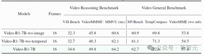 团队还做了一组消融实验,直接「抽掉」图像数据训练、再试试砍掉时间建模模块,结果都一样——模型性能明显下滑。这直接验证了一件事:Video-R1的每一块设计都打在了点子上。