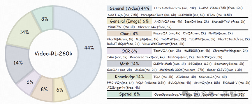 研究人员干脆把图像推理数据请进视频训练流程,做了两个关键数据集:一个是图像为主的 Video-R1-COT-165k,专门用来冷启动模型思维;另一个是以高质量视频为核心的 Video-R1-260k,用来精调强化训练。