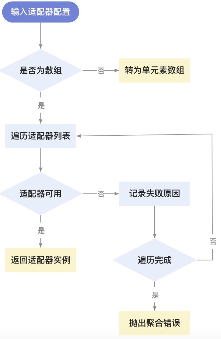 adapters = utils.isArray(adapters) ? adapters : [adapters];'xhr' → 转换为['xhr'][httpAdapter, 'xhr'] → 保持原样2. 适配器遍历逻辑