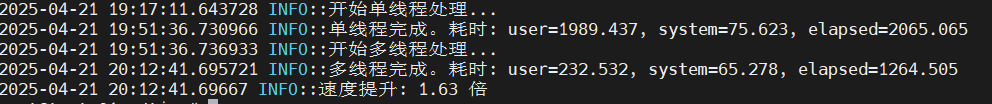 Elapsed Time 远小于单线程,且多线程 CPU Time 远大于其 Elapsed Time。这表明并行计算显著加速了任务,并且 CPU 资源得到了有效利用。Elapsed Time 相比单线程缩短有限,但 CPU Time 显著增加: