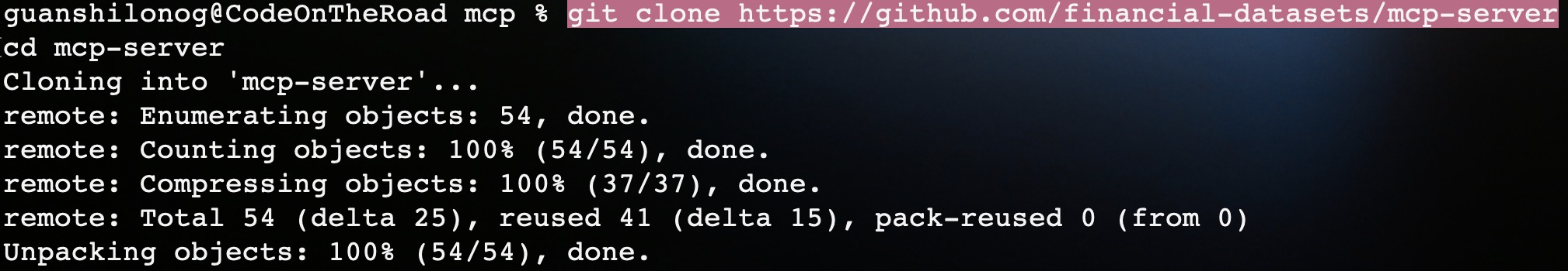 FINANCIAL_DATASETS_API_KEY=your-financial-datasets-api-key这样就完成了 financial-datasets mcp server 的准备配置工作。Financial Datasets 主要是关注美股,所以我们可以使用 mcp-yfinance 来扩充一下A股。
