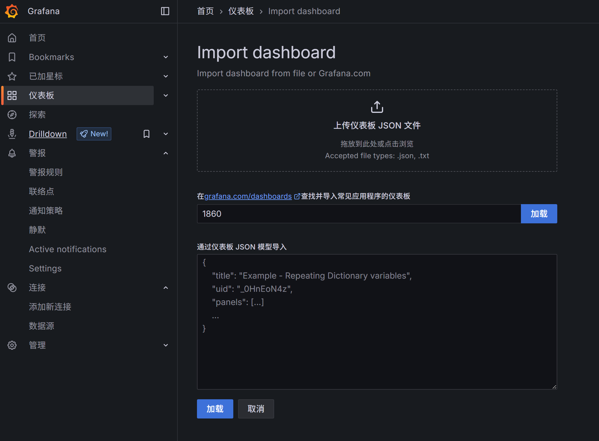 我们搭建监控,最主要是为了监控服务器主机的性能,已经有成熟的可视化模版了,选择导入即可