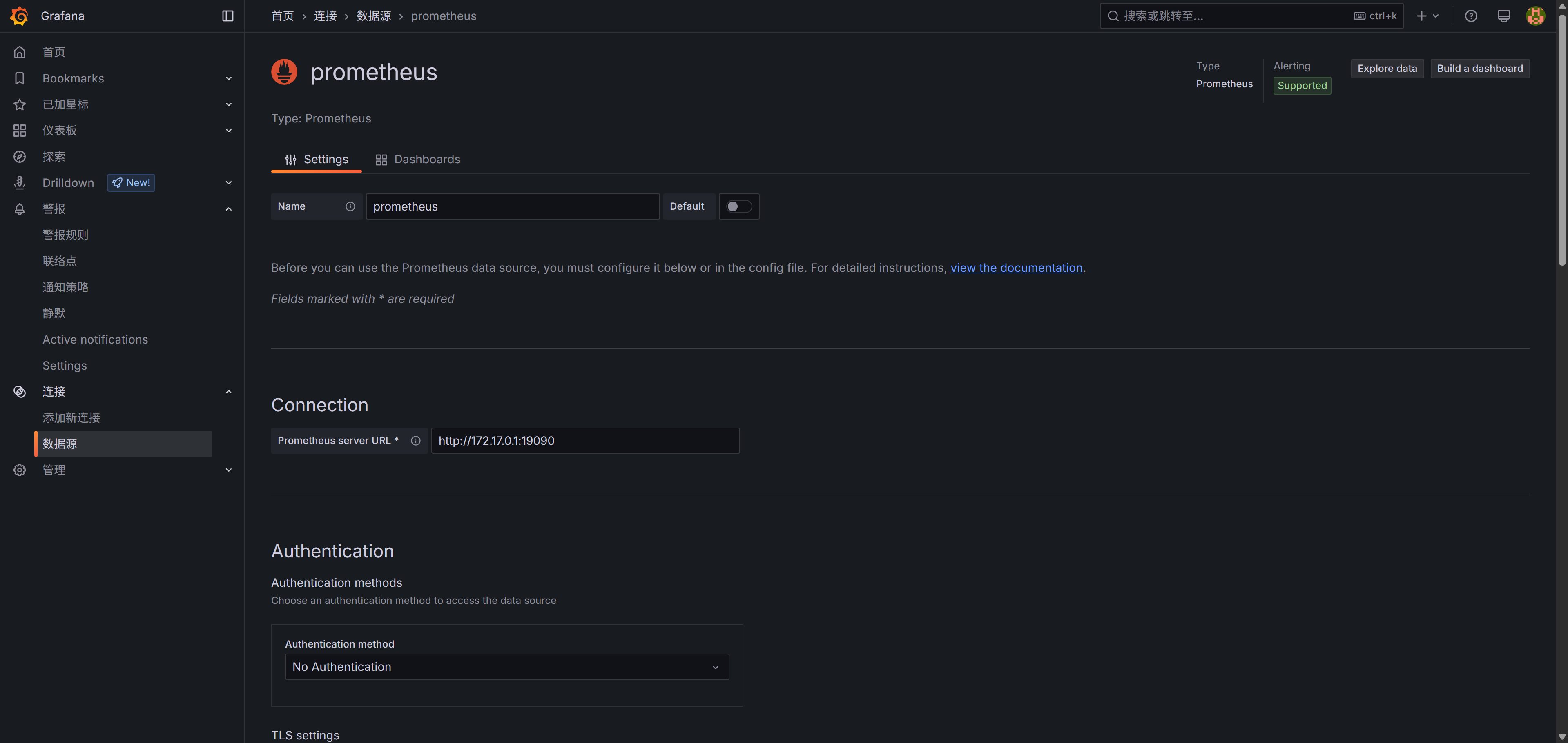 在grafana新建数据源,选择prometheus,然后填写prometheus对应的url,然后保存