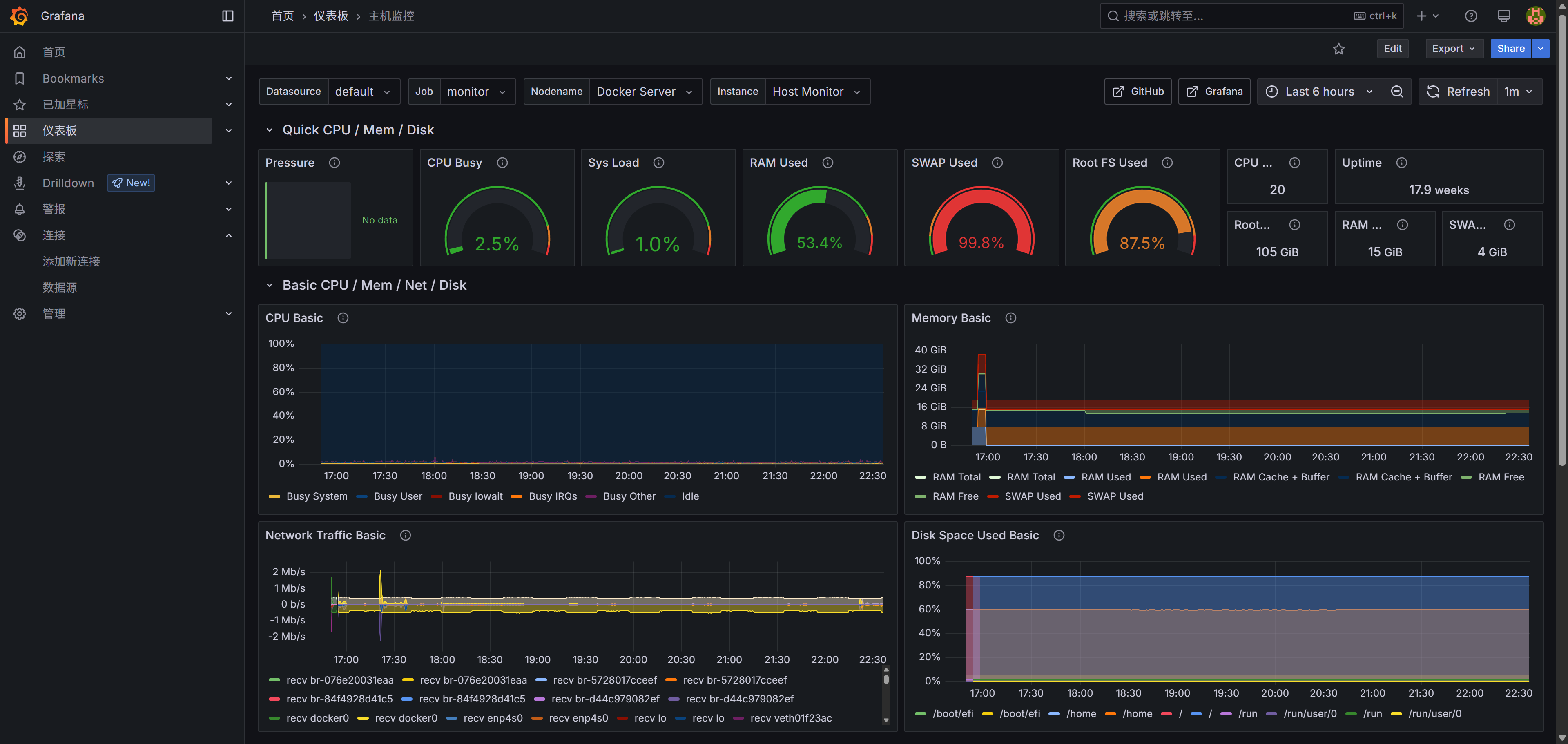 导入仪表盘后,即可看到可视化页面,如果没有数据,也不用急,等后面配置node_exporter就行,配置好的页面如下