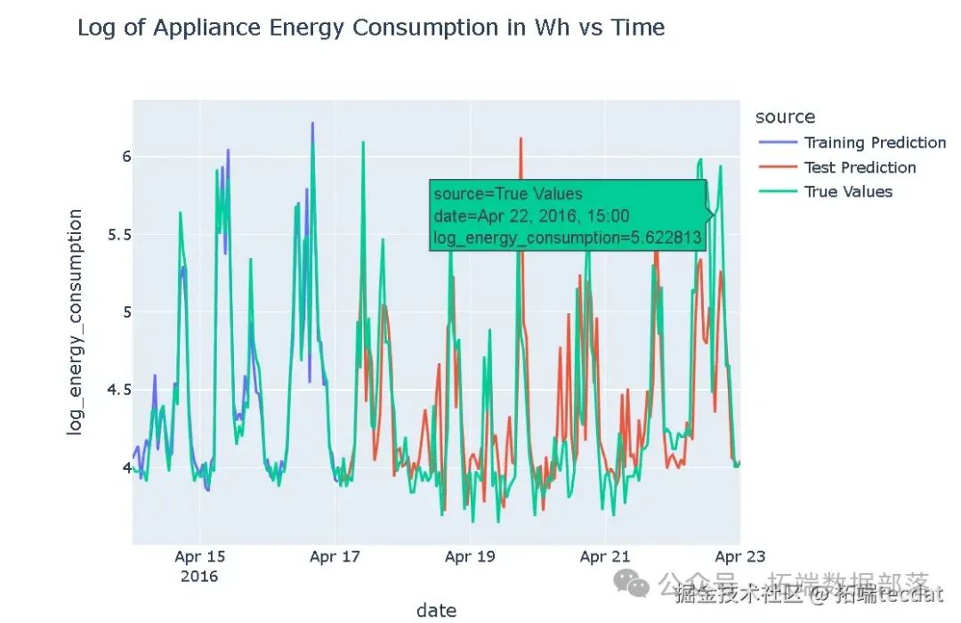 模型在训练集和测试集上都能产生合理准确和合理的结果,与其他现有的基于频率的机器学习和深度学习方法相当。通过对预测值进行逆变换,将其转换回原始尺度,并与真实值进行比较。 AI提示词:定义偏移量,对训练集和测试集的预测值进行逆变换,将预测值和真实值分别存储在数据框中,并添加相应的来源标签,然后将这些数据框连接起来,使用plotly.express绘制对比折线图,展示训练集和测试集上预测值和真实值的对比情况。