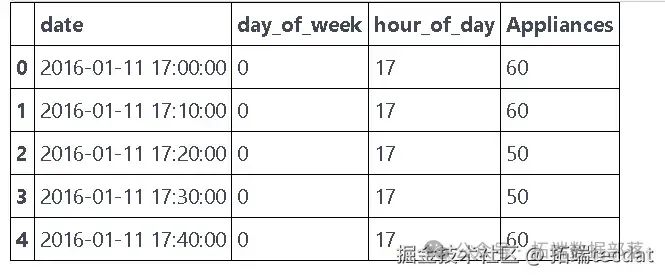 我们使用了一个能耗数据集,为了简化和加快运行速度,只选取了时间相关和自回归相关的特征,包括日期时间(每10分钟采样一次)、能耗(对应10分钟时间戳的瓦时)、星期几(星期一对应0)、一天中的小时数。 AI提示词:读取能耗数据集,将日期列转换为日期时间格式,并提取出月份、日期、星期几和小时数等信息,然后选取指定的列作为有效数据。
