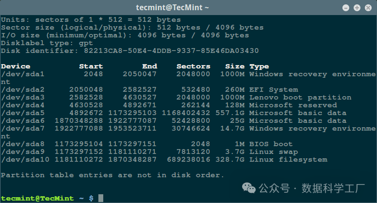 fdisk 命令,查看所有磁盘驱动器或闪存以及它们的分区信息:sudo fdisk -l