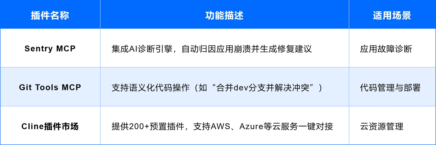 MCP协议的开放性使得开发者可以快速开发适配不同运维需求的插件,从而构建一个插件化生态。以下是部分典型插件的功能描述: