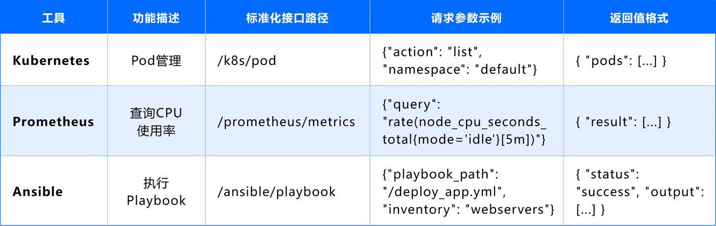 通过上述标准化接口描述,运维人员可以通过MCP协议统一调用工具功能,而无需了解工具的具体实现细节。