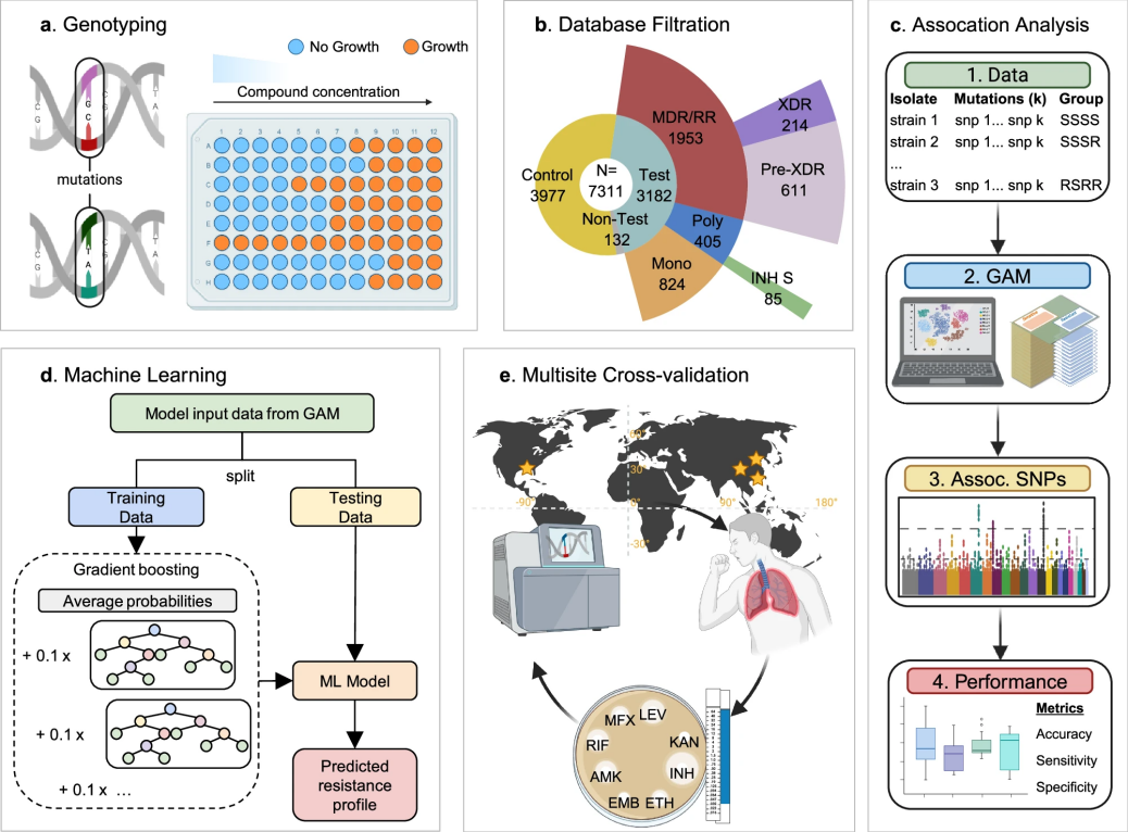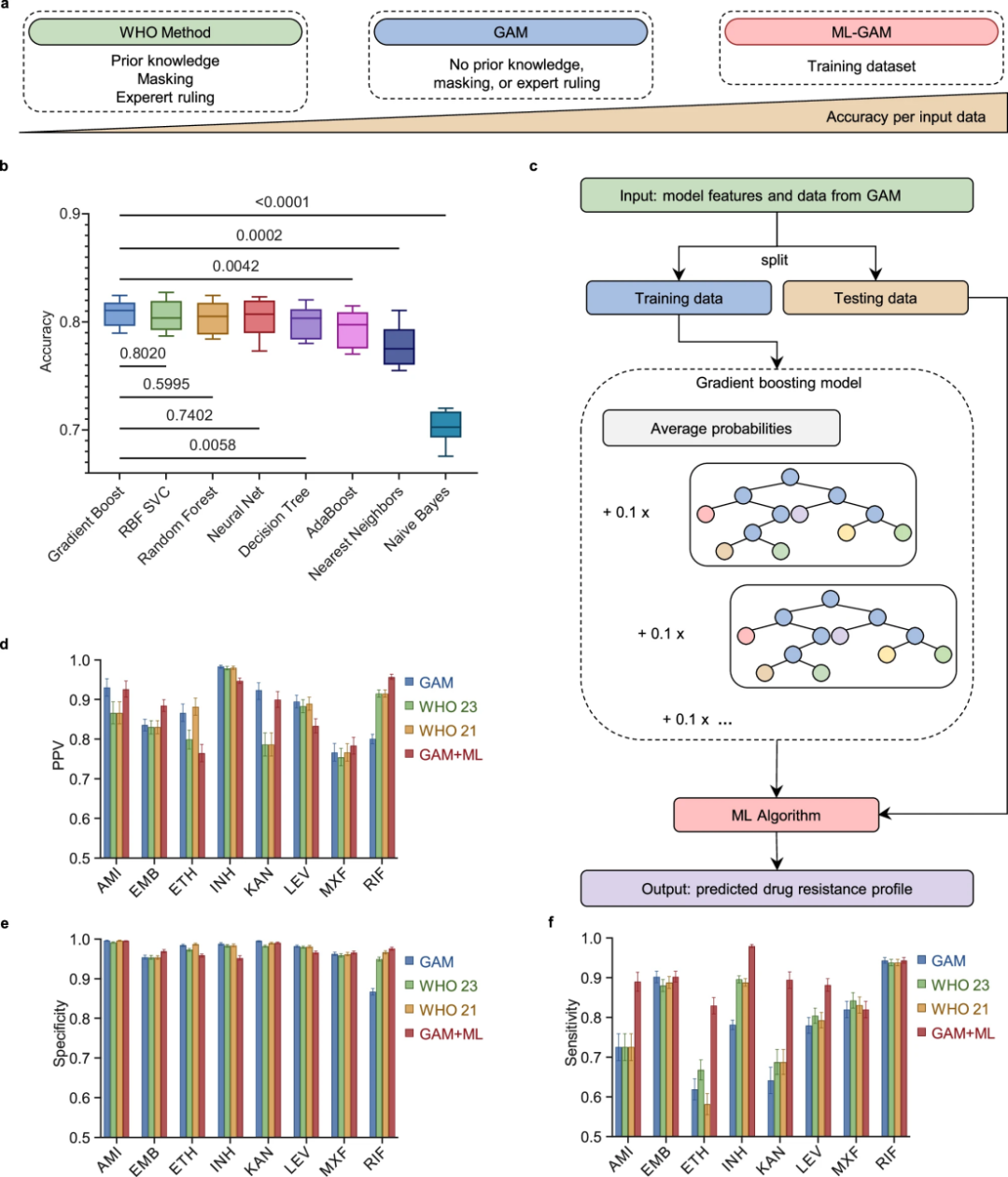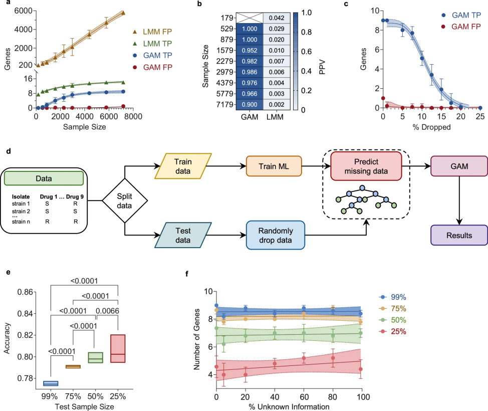传统的耐药性检测方法存在明显缺陷:培养法不仅耗时费力,对于生长缓慢的细菌可能需要数周时间;分子检测方法虽然较快,但只能识别已知的常见突变;DNA测序虽然能发现新的突变,但准确判断这些突变是否导致耐药性仍然困难。研究发现,将GAM与机器学习技术相结合(如图1所示)能显著提升预测准确性,特别是在处理小规模或不完整数据时表现更为出色。这一发现为临床上快速识别耐药性细菌,制定更有效的治疗方案提供了新的可能。