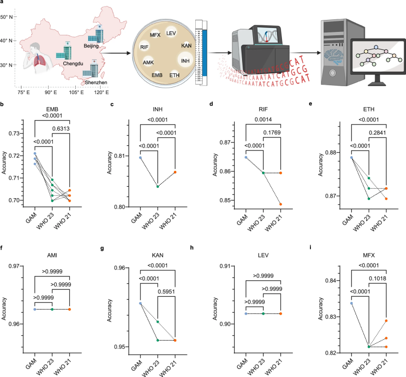 随后,研究团队比较了GAM和WHO目录在机器学习预测中的表现(图6)。使用梯度提升机器学习模型测试发现,GAM在预测阿米卡星、异烟肼、卡那霉素和利福平的耐药性时,准确率高于WHO模型。在427个来自中国三家医院的结核分枝杆菌样本验证中,GAM+机器学习模型在预测6种药物(乙胺丁醇、乙硫异烟胺、异烟肼、卡那霉素、莫西沙星和利福平)的耐药性时表现更优,在其他药物上的预测效果持平。